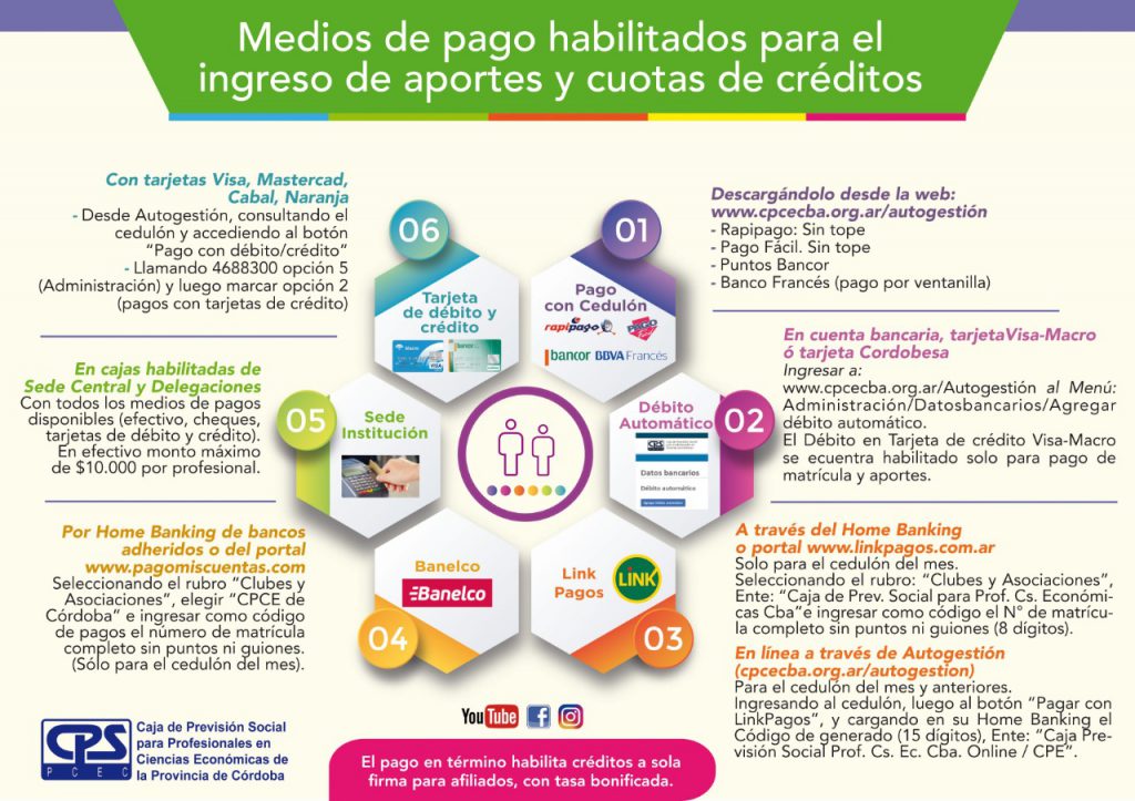 Te informamos los medios de pago habilitados ágiles y sencillos, para abonar las cuotas de préstamos, matrícula profesional y aportes jubilatorios: